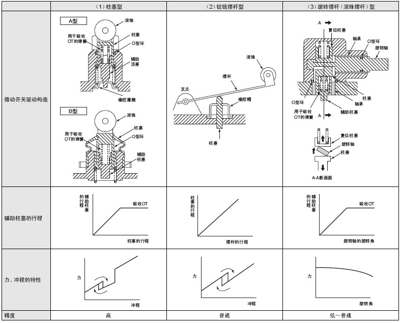 ■ 限位開(kāi)關(guān)的概念限位開(kāi)關(guān),指為保護(hù)內(nèi)置微動(dòng)開(kāi)關(guān)免受外力、水、油、氣體和塵埃等的損害,而組裝在外殼內(nèi)的開(kāi)關(guān),尤其適用于對(duì)機(jī)械強(qiáng)度和環(huán)境適應(yīng)性有特殊要求的地方。 ■ 內(nèi)置微動(dòng)開(kāi)關(guān)驅(qū)動(dòng)機(jī)構(gòu)對(duì)于限位開(kāi)關(guān)來(lái)說(shuō),微動(dòng)開(kāi)關(guān)的驅(qū)動(dòng)機(jī)構(gòu)是與密封性能和動(dòng)作特性直接相關(guān)的重要部分。其構(gòu)造分為三類,如下表所示。 (1)活塞型 (2)鉸鏈擺桿型 (3)旋轉(zhuǎn)擺桿型 ![]()