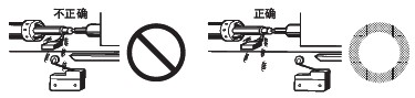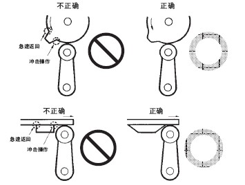● 關(guān)于連接 · 請(qǐng)不要在1個(gè)開(kāi)關(guān)的接點(diǎn)上連接異極、異種的電源。 · 在電路設(shè)計(jì)時(shí)請(qǐng)不要在接點(diǎn)間加電壓。(可能導(dǎo)致混觸熔化) · 即使在發(fā)生異常情況時(shí), 也不要出現(xiàn)短路的電路。(可能導(dǎo)致導(dǎo)電部位的熔斷) · 開(kāi)關(guān)用于電子電路(低電壓· 低電流) 1. 接點(diǎn)的振動(dòng)、震顫會(huì)帶來(lái)問(wèn)題時(shí),請(qǐng)采取下面的措施。 ● 關(guān)于使用環(huán)境 · 請(qǐng)不要在有引火性氣體、爆炸性氣體等環(huán)境中單獨(dú)使用開(kāi)關(guān)。隨著開(kāi)關(guān)引起的電弧發(fā)熱,會(huì)造成失火或爆炸等原因。 · 限位開(kāi)關(guān)也會(huì)由于在室外或特殊的切削油的關(guān)系導(dǎo)致開(kāi)關(guān)材質(zhì)變質(zhì)及劣化,因此選擇機(jī)種時(shí)請(qǐng)垂詢。 · 請(qǐng)不要在有熱水(+60℃以上) 的地方和水蒸氣中使用。 · 操作人員不小心將開(kāi)關(guān)安裝在易發(fā)生誤動(dòng)作或事故的地方時(shí),請(qǐng)加裝外罩。 · 開(kāi)關(guān)受到連續(xù)的振動(dòng)和沖擊時(shí),產(chǎn)生的磨損粉末可能導(dǎo)致接點(diǎn)接觸不良和動(dòng)作失常、耐久性下降等問(wèn)題。此外,如有過(guò)大的振動(dòng)和沖擊,可能會(huì)發(fā)生接點(diǎn)的誤動(dòng)作和破損等,因此請(qǐng)將其安裝在不會(huì)受到振動(dòng)和沖擊的位置和不會(huì)發(fā)生共振的方向上。 ● 關(guān)于定期檢查和定期更換 · 在一直按下的狀態(tài)下, 如果開(kāi)關(guān)頻率較低(1次以下/日), 則可能會(huì)由于零件的劣化導(dǎo)致復(fù)位不良。請(qǐng)事先確認(rèn)并定期進(jìn)行檢查。 ● 關(guān)于開(kāi)關(guān)的保管 · 請(qǐng)避免在惡性氣體(H2S、SO2、NHO3、Cl2等) 和有塵埃、高溫多濕的環(huán)境中存放開(kāi)關(guān)。 ● 關(guān)于耐氣候、耐寒、耐熱規(guī)格 為了提高耐氣候、耐寒、耐熱性能, 使用了硅橡膠, 硅橡膠部分情況下可能產(chǎn)生硅氣體(常溫下可能發(fā)生, 高溫下產(chǎn)生量會(huì)進(jìn)一步增加) 。 這種氣體通過(guò)電弧能量反應(yīng), 會(huì)生成二氧化硅(SiO2) 。二氧化硅(SiO2) 不斷堆積在接點(diǎn)上, 會(huì)發(fā)生接觸障礙, 可能影響設(shè)備的正常運(yùn)行。使用前請(qǐng)務(wù)必按照實(shí)際使用條件(包括環(huán)境、動(dòng)作次數(shù)) 進(jìn)行評(píng)價(jià), 在確認(rèn)性能上沒(méi)有問(wèn)題后, 在進(jìn)行使用。 ● 關(guān)于室外使用 · 在有泥水、粉塵的地方, 請(qǐng)使用機(jī)械部位密封的橡皮帽限位開(kāi)關(guān)。 ● 關(guān)于操作 ·為避免開(kāi)關(guān)的驅(qū)動(dòng)桿急速返回或受到?jīng)_擊, 請(qǐng)考慮操作體(凸輪、擋塊等) 進(jìn)行操作。以相對(duì)快的動(dòng)作操作開(kāi)關(guān)時(shí), 必須使用能對(duì)繼電器和閥門(mén)進(jìn)行充分勵(lì)磁且保持行程較長(zhǎng)的凸輪和擋塊。 · 在旋轉(zhuǎn)運(yùn)動(dòng)、直線運(yùn)動(dòng)時(shí)也必須在開(kāi)關(guān)的驅(qū)動(dòng)桿上施加正常的載荷。如下圖所示, 擋塊觸到擺桿時(shí), 動(dòng)作位置將無(wú)法穩(wěn)定。 · 請(qǐng)不要在開(kāi)關(guān)的驅(qū)動(dòng)桿上施加偏載荷, 或者引起局部磨擦。 · 如果從斜面向開(kāi)關(guān)的驅(qū)動(dòng)桿(滾珠) 上施加載荷, 可能會(huì)造成驅(qū)動(dòng)桿和旋轉(zhuǎn)軸的變形、折損,因此請(qǐng)保持擋塊垂直。 · 請(qǐng)?jiān)O(shè)置驅(qū)動(dòng)桿不超過(guò)過(guò)行程(OT)。過(guò)行程(OT)超過(guò)限制的話,可能引起故障。安裝時(shí)請(qǐng)充分考慮操作總行程后進(jìn)行調(diào)整。 · 過(guò)行程過(guò)大時(shí), 可能會(huì)誘發(fā)早期的故障。因此在安裝時(shí)必須進(jìn)行調(diào)整,必須事先對(duì)操作體的工序進(jìn)行充分的討論。 · 在針狀按鈕型中, 按鈕的行程和操作體的行程必須在一條垂直線上。 · 請(qǐng)配合驅(qū)動(dòng)桿的特性使用開(kāi)關(guān)。請(qǐng)不要如下圖所示箭頭方向那樣使用滾珠懸臂擺桿型。 · 請(qǐng)不要對(duì)驅(qū)動(dòng)桿進(jìn)行加工而導(dǎo)致動(dòng)作位置的變化。 ● 擋塊的設(shè)計(jì) 關(guān)于擋塊的速度及角度與驅(qū)動(dòng)桿的關(guān)系 <滾珠擺桿型驅(qū)動(dòng)桿> (1)擋塊不會(huì)越過(guò)驅(qū)動(dòng)桿的情況下