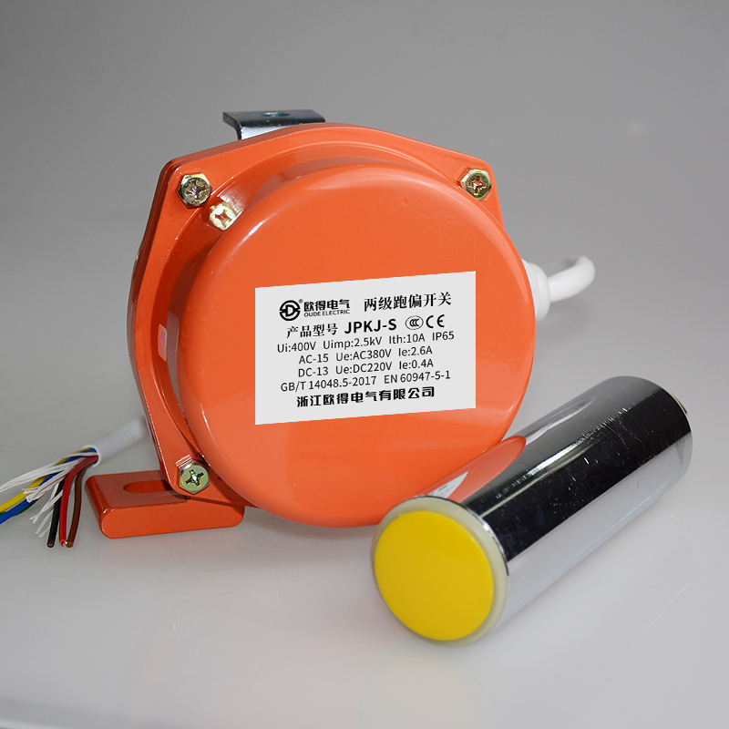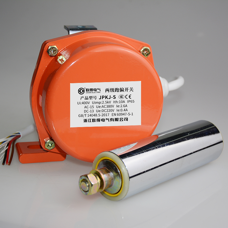 兩級跑偏開關(guān)(JPKJ-S),絕緣電壓400伏,發(fā)熱電流10安培,工作電壓電流交流380伏、2.6安培,直流220伏、0.4安培,防護等級IP65。主要用于輸送機膠帶跑偏檢測,防止膠帶跑偏而造成物料溢出等故障。當(dāng)膠帶發(fā)生跑偏時,膠帶邊緣帶動立棍旋轉(zhuǎn)并擠壓立棍使之傾斜。若立棍傾斜大于一級動作角度時,開關(guān)便發(fā)出一組信號用于警告,若立棍傾斜大于二級動作角度時,開關(guān)便發(fā)出另一組信號用于停機。膠帶機恢復(fù)正常運行后,立棍自動復(fù)位。